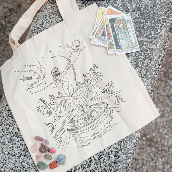Artemisa, diosa de la caza, la naturaleza y la luna, se representa en este diseño como una figura celestial, cuya conexión con el cosmos es tan profunda como su vínculo con la tierra.